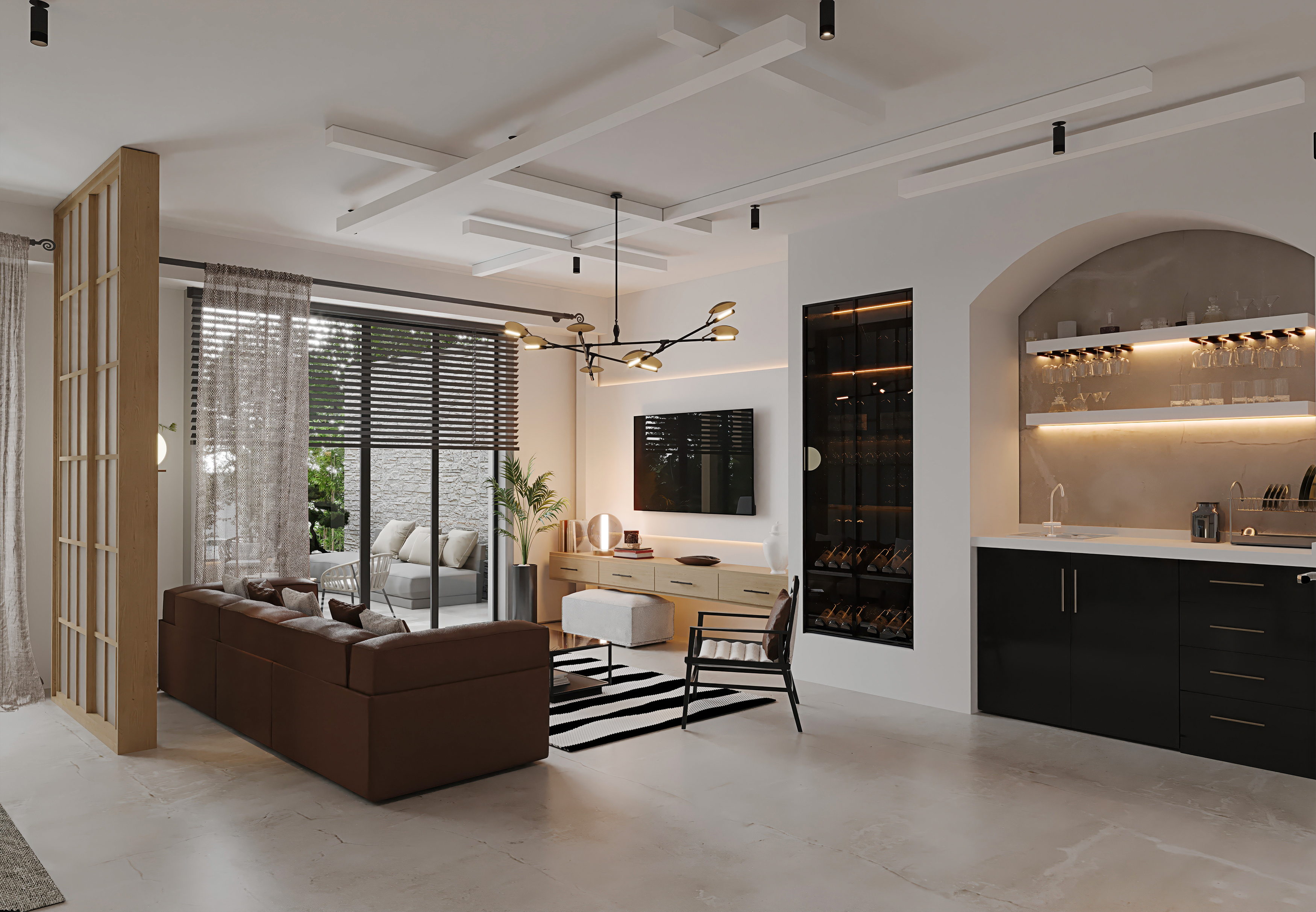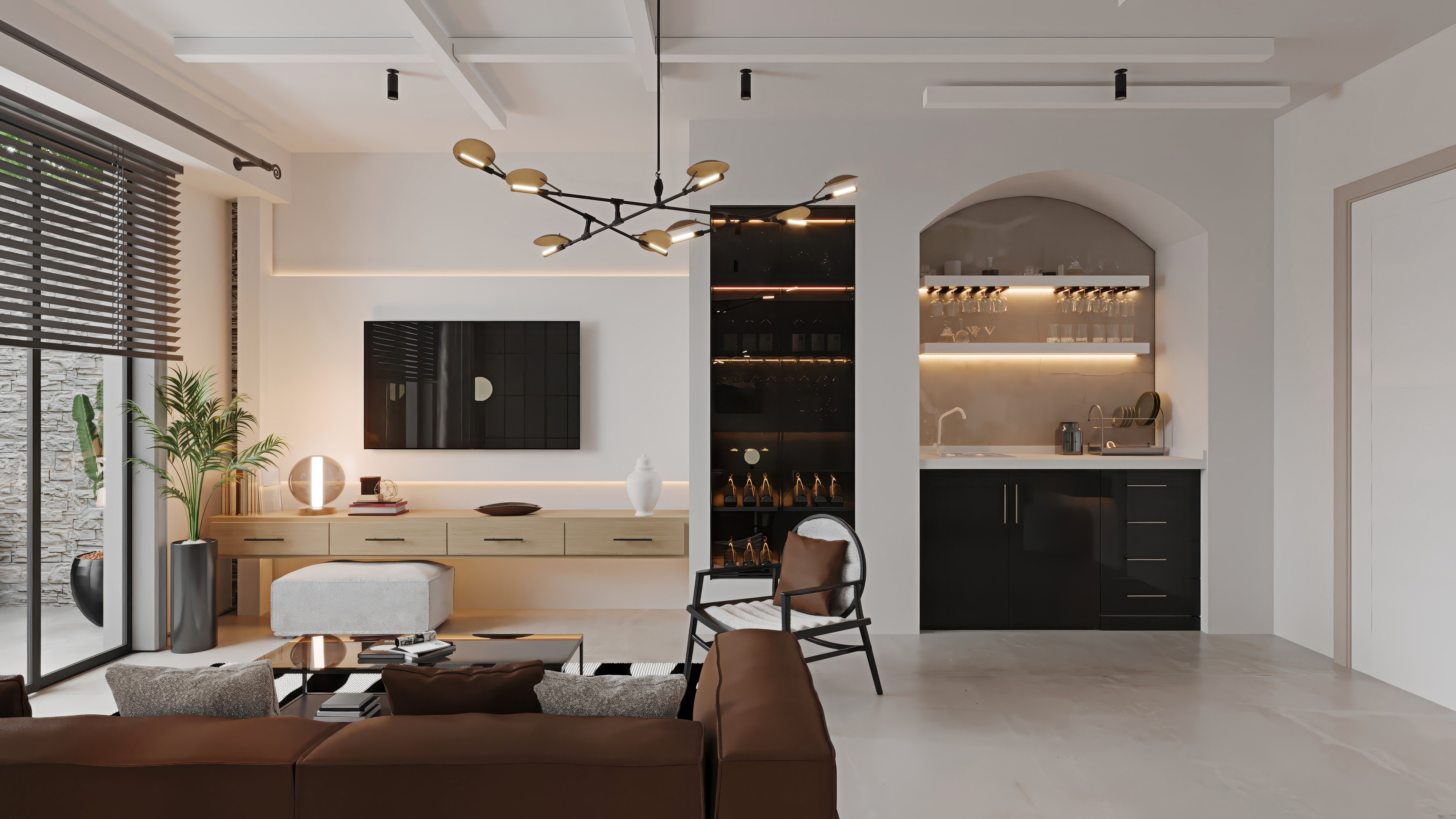 Ana girişten itibaren sizi karşılayan kompakt ve şık kitchenette, tasarladığımız niş detayı sayesinde oturma alanından zarif bir şekilde ayrılıyor. Salon bölümündeki konforlu oturma grubu ise boydan boya uzanan geniş pencereler sayesinde iç mekânı bahçe ve havuzla bütünleştiriyor.
