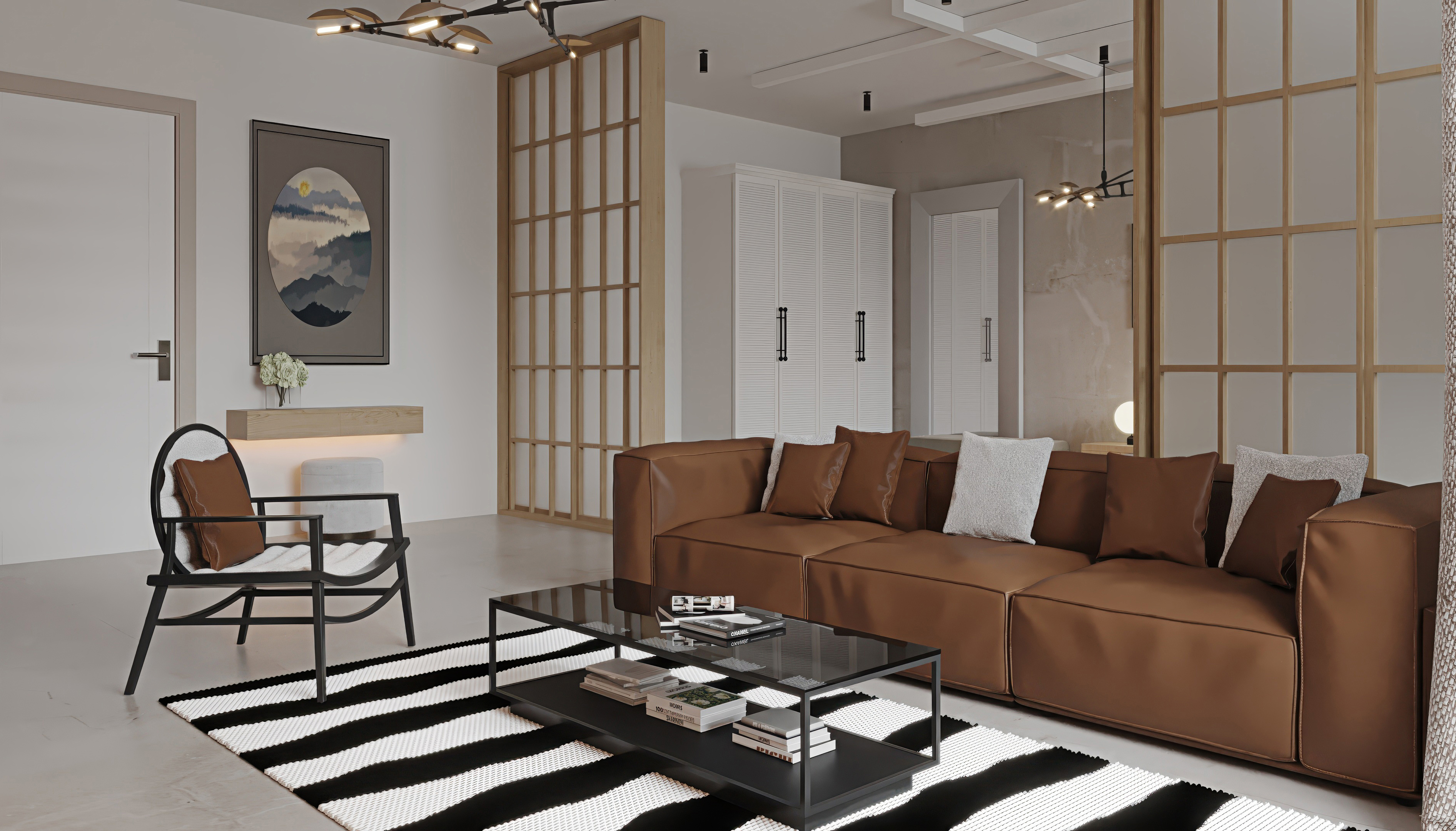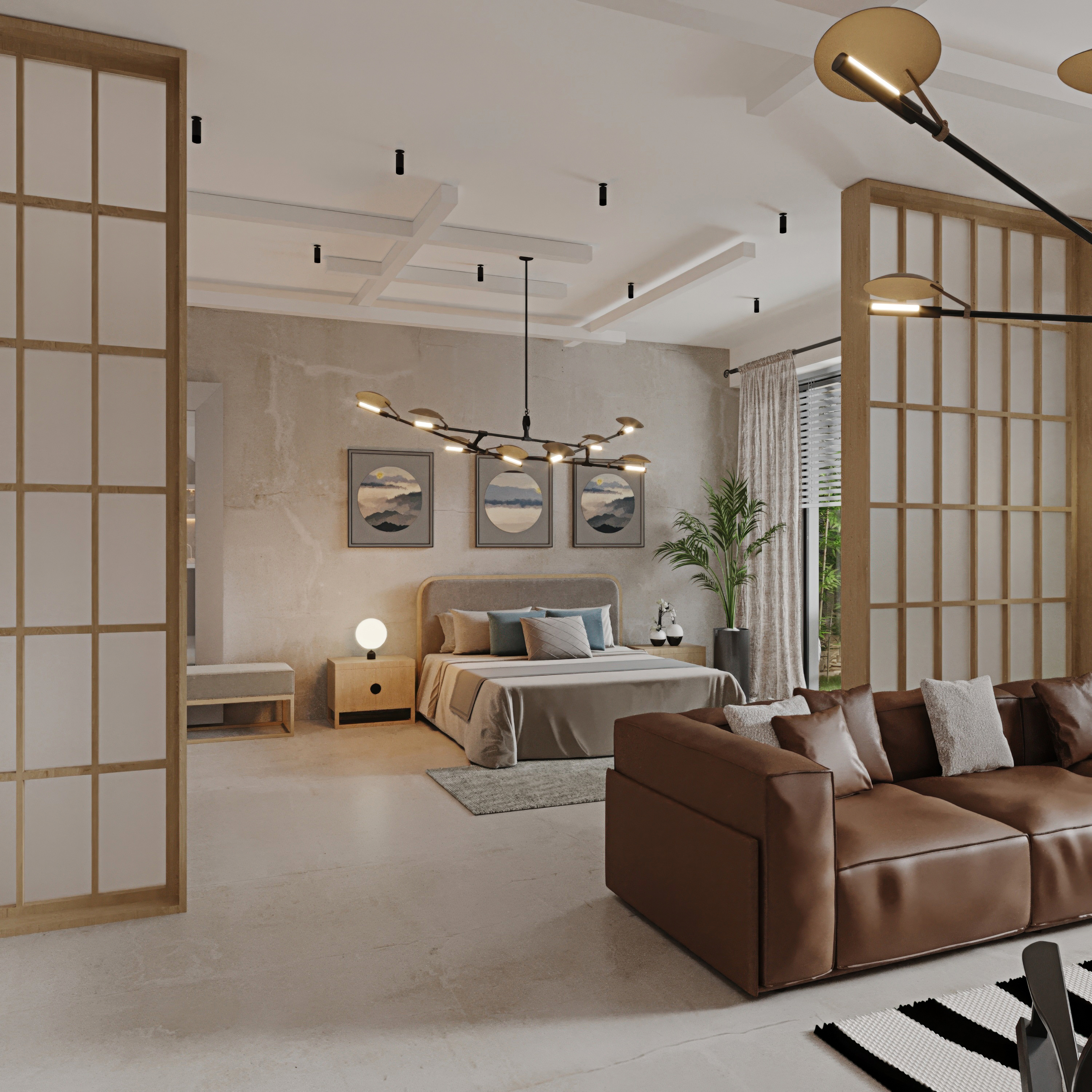 Bu projenin en karakteristik özelliği, alanı daraltan hantal duvarlar yerine kullandığımız masif ahşap seperatörler. Yatak odası ve oturma alanını birbirinden ayıran bu doğal dokulu paneller; ışığın mekân içinde serbestçe dolaşmasını sağlarken, görsel kesintisizliği koruyor ve modern mimari dile organik bir sıcaklık katıyor.
