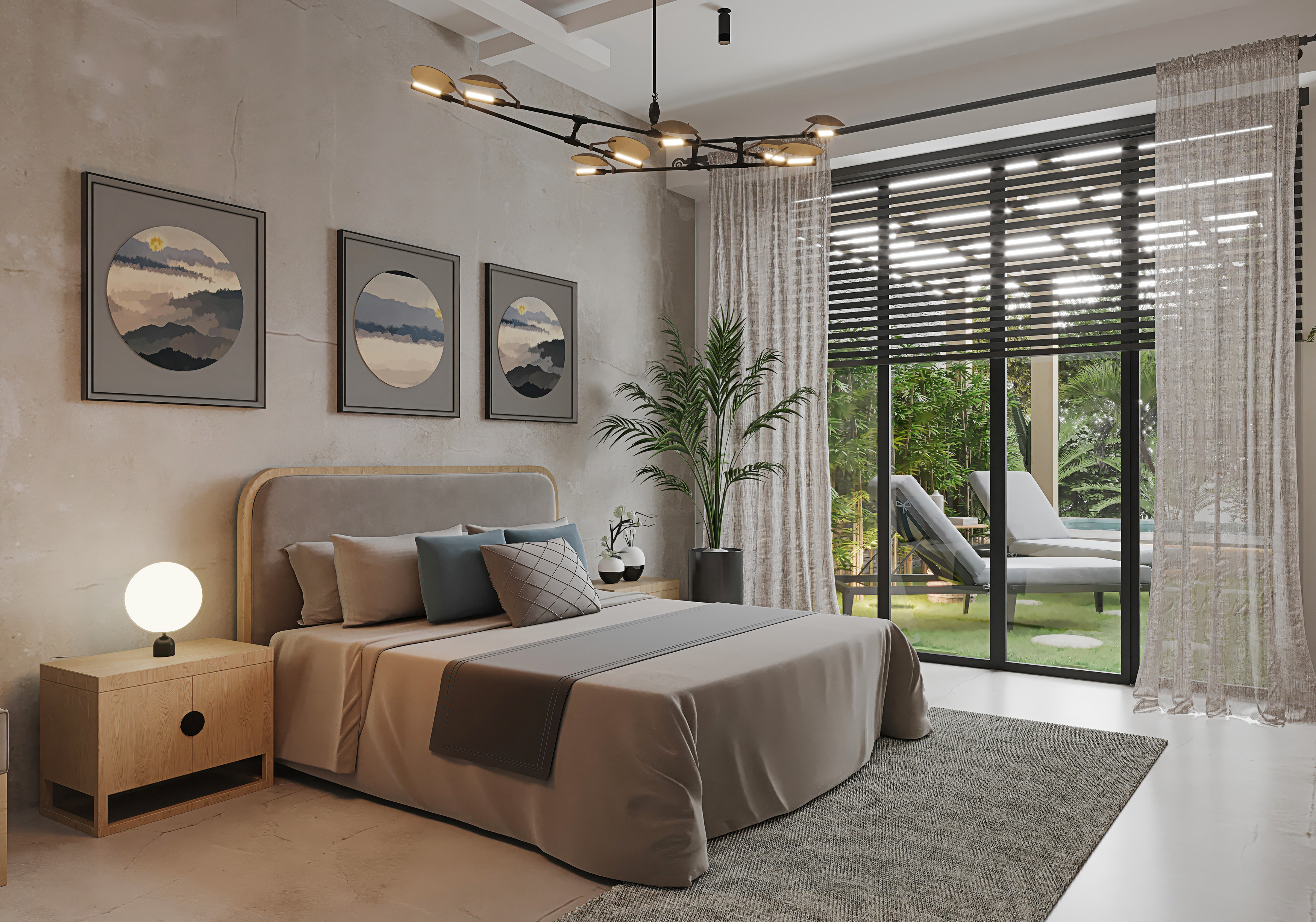 Tasarımın dilini modern ve minimal bir çizgiye taşıyan malzeme seçimlerimizde doğallığı ön planda tuttuk. Tüm zeminde ve yatak başı duvarında tercih ettiğimiz mikrobeton uygulaması, mekâna endüstriyel bir şıklık ve dokusal bir derinlik kazandırıyor. Duvarlarda kullanılan açık renk paleti, Urla’nın doğal ışığını içeri davet ederken ahşabın sıcaklığı ile uyumlu bir denge kuruyor.